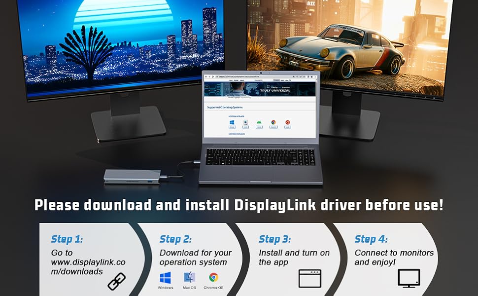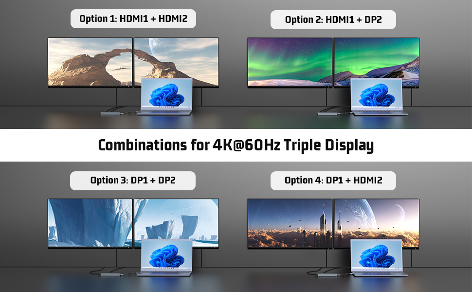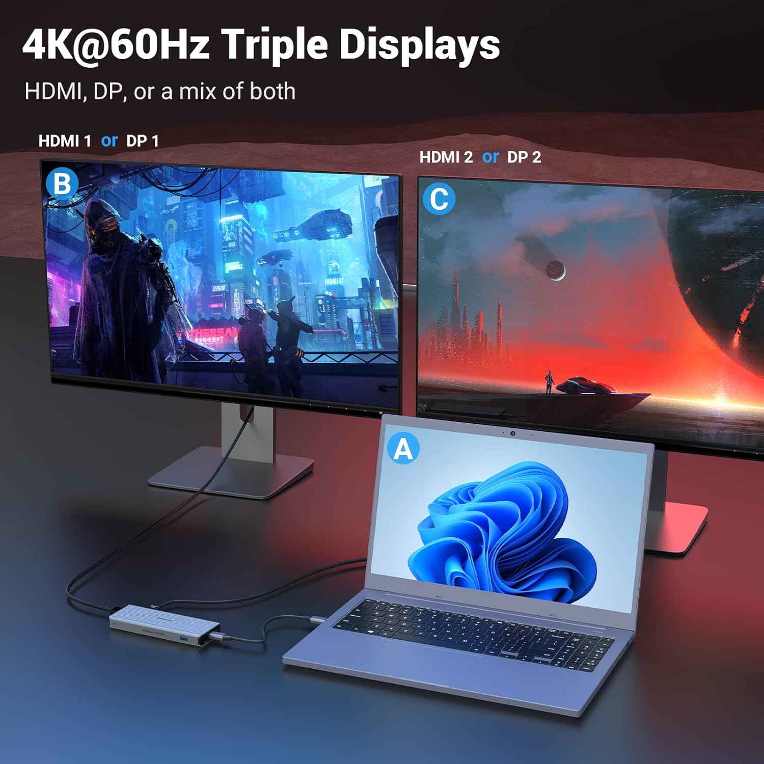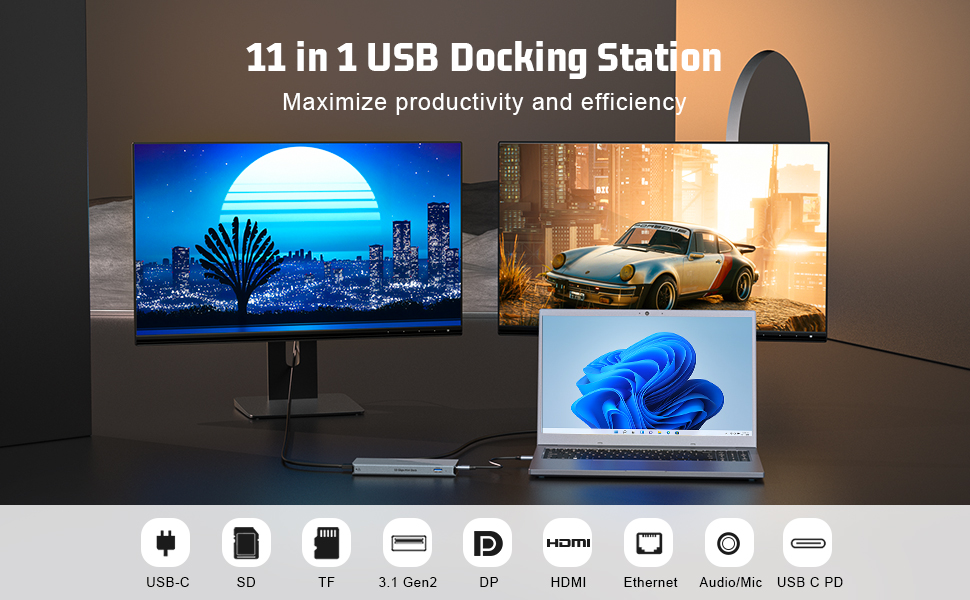Laptop Docks (3*USB-A 3.1, 1*100W USB-C PD 3.0, 2*4K HDMI 2.0, 2*4K DP,1*1 GBPS Ethernet, 1 *Audio/Mic Jack). With free 1 x USB C to C cable/USB C to A cable, this mini dock is both with USB 3.0 one port and with full function USB C port.