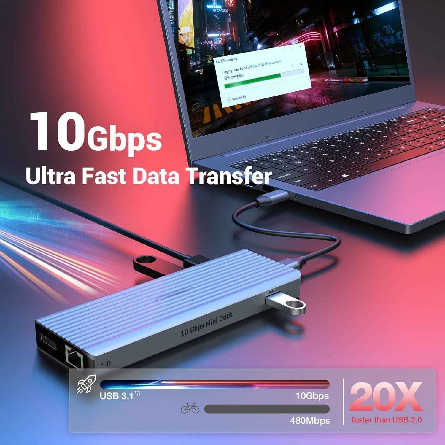 - Ultra High Speed Data Transfer: Equipped with USB 3.2 GEN2 data ports with 10Gbps effortless transfer speed, this MacBook Pro/Air Hub allows you to transfer 1G files in just 10 seconds. Support U disk, mouse, keyboard, printer, camera, SSD, mobile hard drive and other devices with USB-C port.
