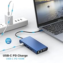 - Powerful USB C Hub: The Gigabit Ethernet port supports 10/100/1000 Mbps network speeds, anywhere and in no time at all. The PD charging port supports 100W/20V/5A, which allows you to charge your Type-C devices quickly. You can use this MacBook Pro docking station to power your laptop with your original 87W adapter. Please note: the PD type C charging port only applies to devices with PD protocol.