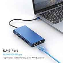 - 12-in-1 USB C Docking Station: USB C laptop docking station works perfectly with the type C laptop devices with the multiport USB C adapter, including: dual 4K HDMI & 1 x VGA, 2 x USB 3.0 ports & 2 x USB 2.0 ports, 1 x USB-C 3.0 ports, 1 x Gigabit Ethernet LAN, 1 x Type C power delivery ports and 1 ports * SD/TF Card Reader