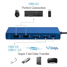 - 5 USB Ports and SD/TF Reader: 1 USB-C ports, 2 USB 3.0 ports with a data transfer rate of 5 Gbps and an output power of 4.5 W (5 V/900 mA). And 2 USB 2.0 ports are best used for your mouse, keyboard and other low rate devices. The built-in SD and TF slot allows easy access to files from universal SD and Micro SD memory cards with a super speed of up to 5 Gbps.