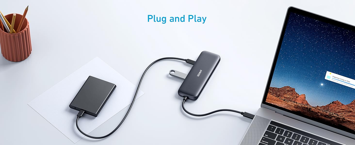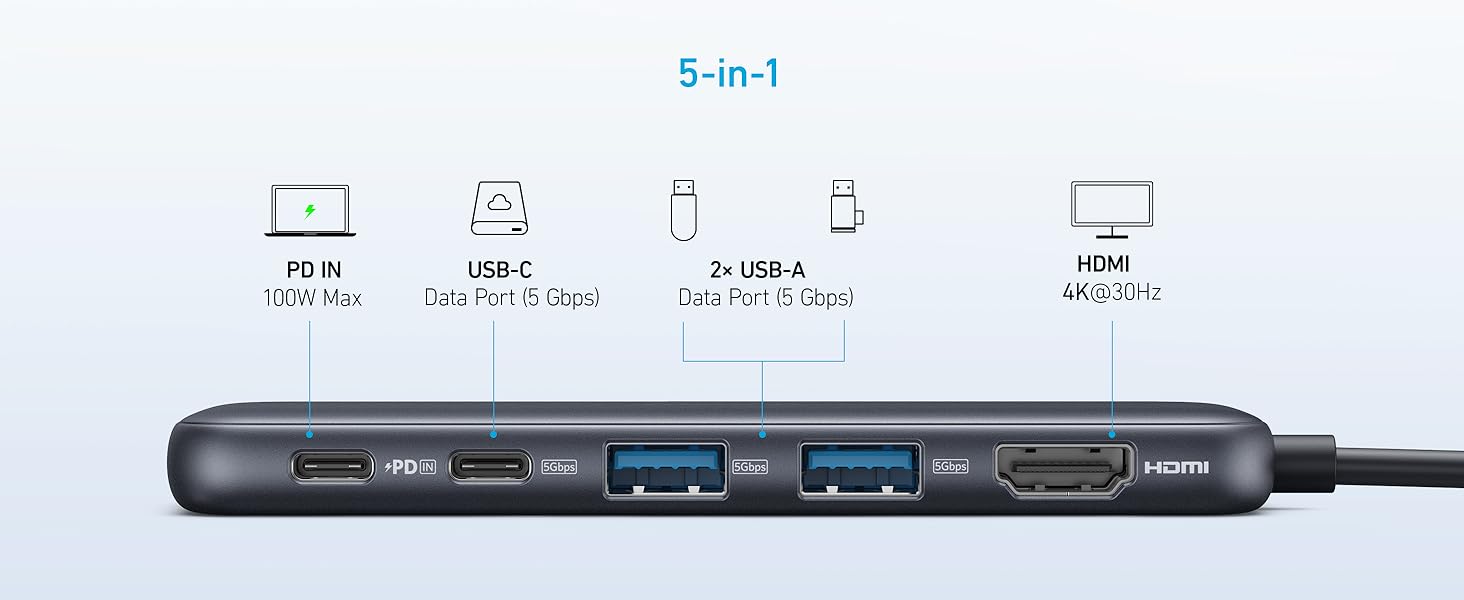 - 5-in-1 Connectivity: Equipped with a 4K HDMI port, a 5 Gbps USB-C data port, two 5 Gbps USB-A ports, and a 100W PD-IN port.
