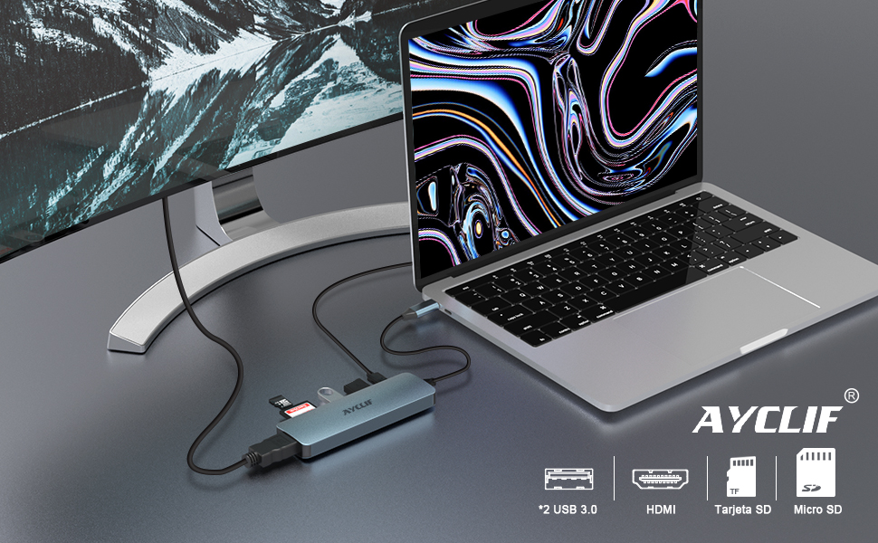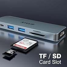 - 6 in 1 USB-C Hub Plug Play: This 6-Port Laptop USB-C Multiport Adapter (2 USB 3.0 ports, 1 HDMI port, 1 Power Delivery charging port, 1 SD card reader, 1 TF card reader). Plug and Play, no additional software and drivers required.